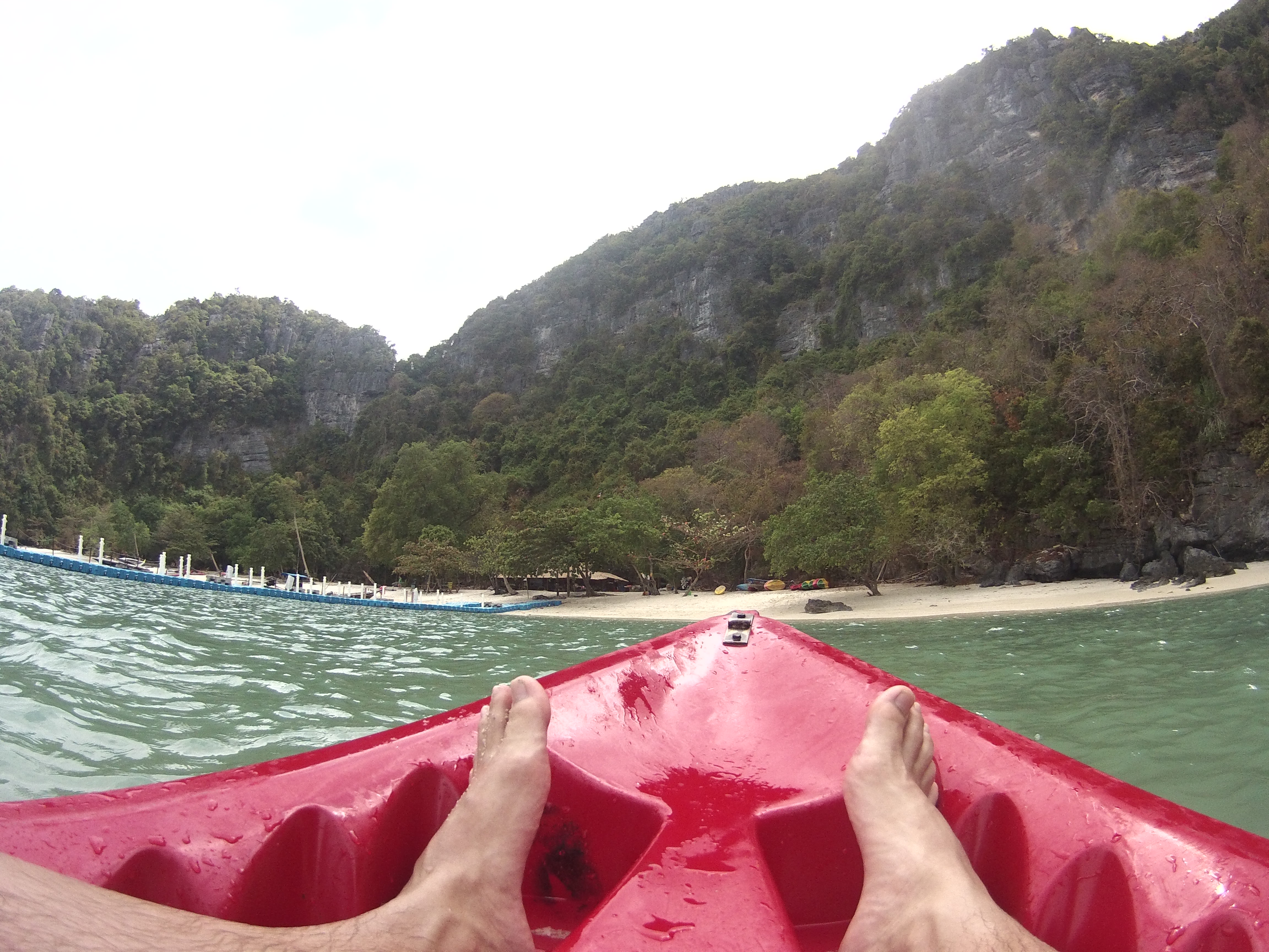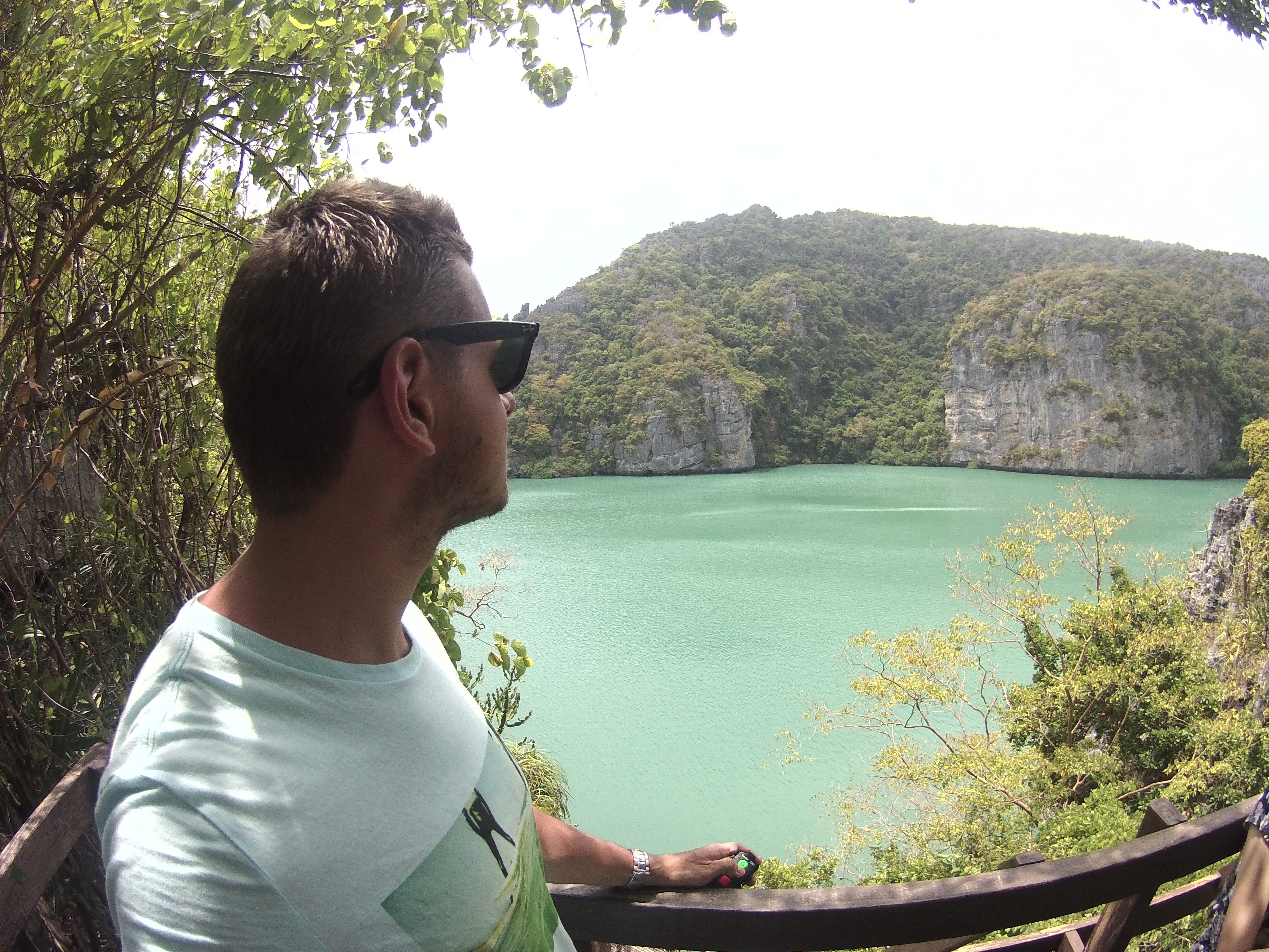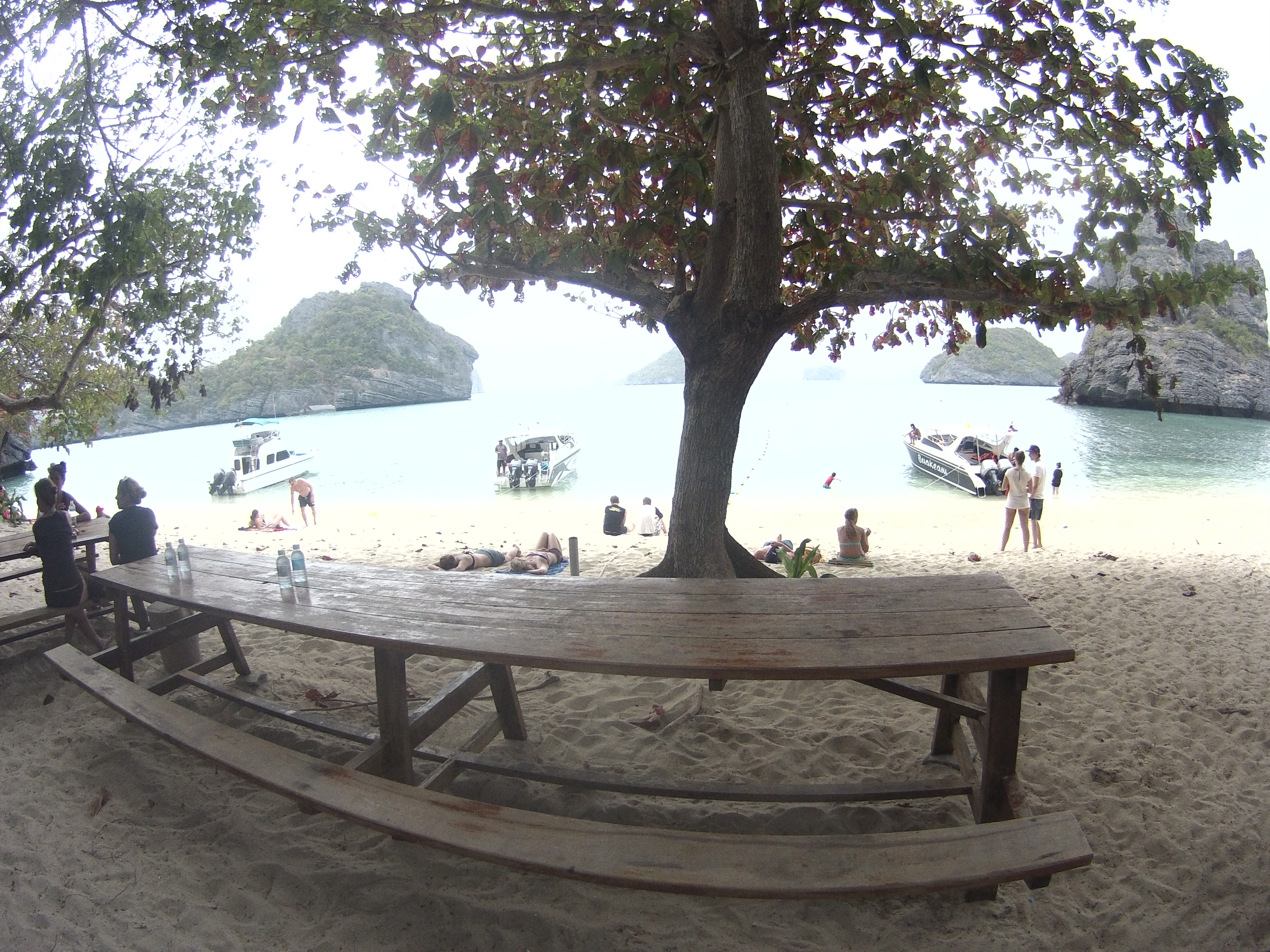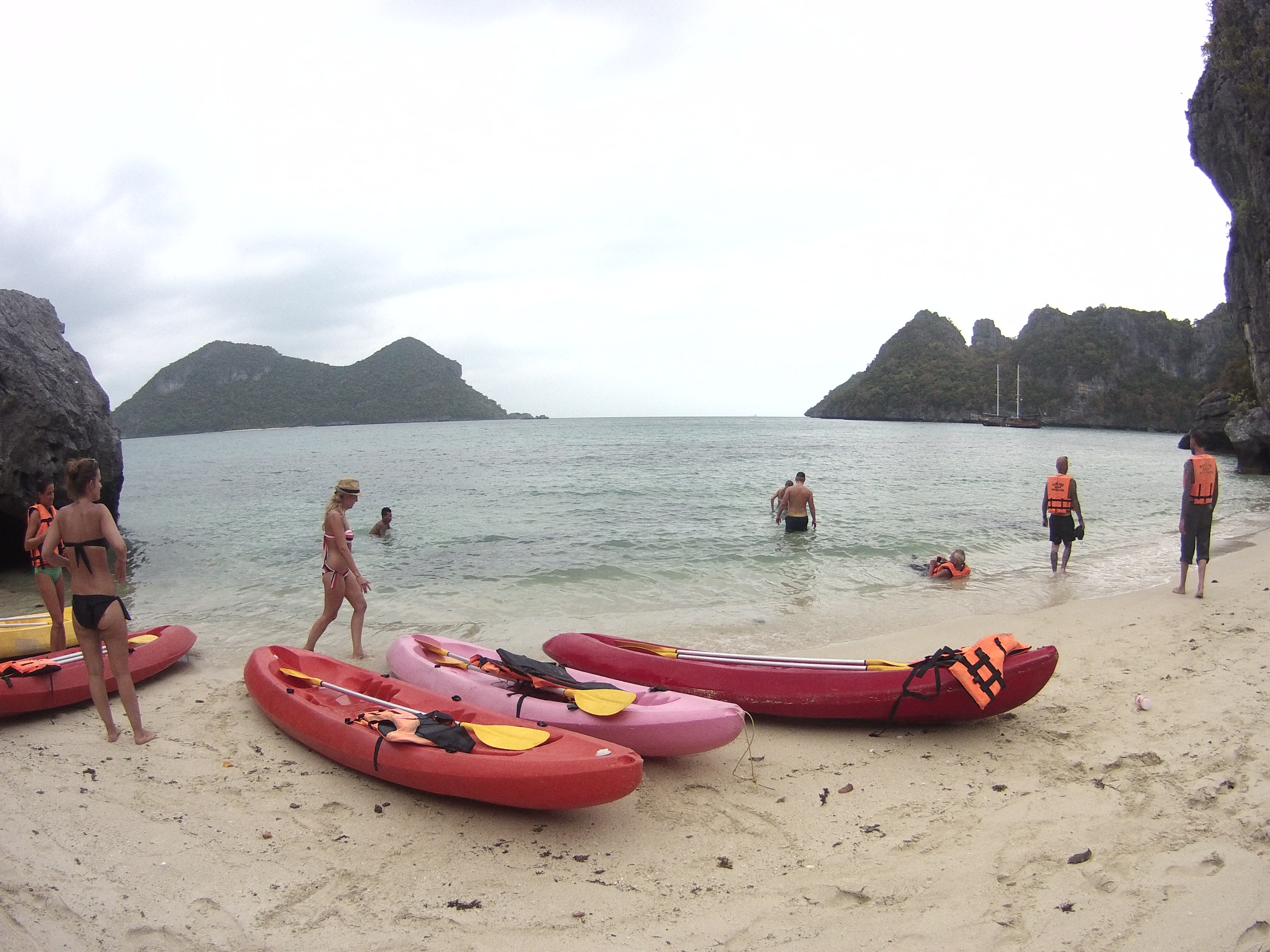 Für den darauffolgenden Tag, den Mittwoch 12.03.2014, hatte ich im Resort eine Tagestour zu dem nahegelegenen Ang Thong Marine National Park, einem Nationalpark bestehend aus 42 kleinen unbewohnten Inseln, gebucht. Mit dem Schnellboot wurden kleine Buchten angefahren, an denen man im kristallklaren Wasser schnorcheln konnte, es wurden atemberaubende Lagunen (Thale Noi) besucht, Kajak gefahren, am Privatstrand Mittag gegessen (Samsao Island), viewpoints besucht und man konnte einfach nur ungestört die Seele baumeln lassen. Um 17 Uhr war der ganze Spaß leider wieder vorbei und ich fuhr von Ko Phangan weiter mit der Fähre Richtung Ko Tao. Da ich für diesen Aufenthalt leider keine Unterkunft im Voraus buchen konnte, hatte ich dann gegen 21 Uhr die Freude vollbepackt ein Hostel zu suchen. Nach 1h Suche, 4km hinter mir und der Bekanntschaft eines Leidensgenossen hatte ich nun im Koh Tao Backpackers Hostel einer der letzten Betten für 2 Nächte gebucht und konnte mit der eben gemachten Bekanntschaft den Abend am Strand (Lotus Bar) inmitten von Feuer-Shows genießen.